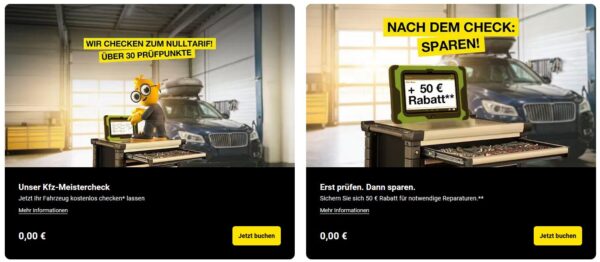 Bedingungen: Der kostenlose Kfz-Meistercheck ist lediglich für Pkw im Aktionszeitraum bis zum 15. September 2025 in teilnehmenden Betrieben und in vollem Umfang nur für Fahrzeuge ausschließlich mit Verbrennungsmotor gültig. Ausgenommen sind HU/AU, Scheibenservices und Versicherungsleistungen, Reifen und Reifenservices sowie gesondert gekennzeichnete Produkte und Services. Der Rabatt ist nicht kombinierbar und gilt nur bei Inanspruchnahme des kostenlosen Kfz-Meisterchecks ab einem Autoservice-Gesamtwert von 300 € sowie nur bis zum 26. September 2025. Wenn wir bei unserem Kfz-Meistercheck Mängel an Ihrem Auto feststellen, steht es Ihnen frei, diese direkt von unseren Werkstatt-Heldinnen und -Helden beheben zu lassen und dabei auch noch zu sparen. Denn wir spendieren Ihnen einen Preisnachlass von 50€ auf anschließende Autoservices – ab einem Autoservice-Gesamtwert von 300€