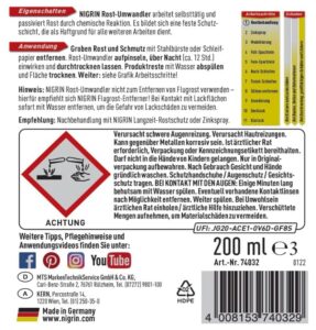 - Lieferumfang: 1 x 200 ml NIGRIN Rost-Umwandler