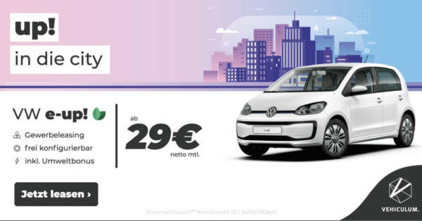 Du bist gewerbetreibend und suchst gerade nach einem neuen, fahrbaren Untersatz? Dann könnte es durchaus sein, dass wir genau das Richtige für dich haben! 😉 Bei Vehiculum gibt es gerade den Volkswagen e-up für 29€ (Netto) pro Monat. Das Angebot versteht sich bei einer Laufzeit von 36 Monaten und einer jährlichen Laufleistung von 10.000 Kilometer.