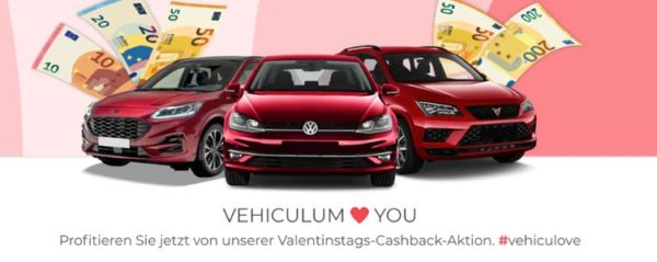 Bei Vehiculum läuft weiterhin die ursprüngliche Valentinstags-Aktion statt, bei der man bis zu 1.000€ Cashback beim Abschluss eines Leasingvertrags bekommt! 🚗