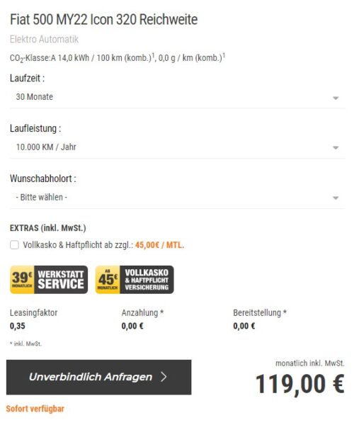 Du suchst gerade nach einem neuen, fahrbaren Untersatz? Dann könnte es durchaus sein, dass wir genau das Richtige für dich haben! 😉 Bei Koenigdeals gibt es gerade den Vollelektrischer Fiat 500e (23,8 kWh mit 118 PS) für 119€/Monat. Das Angebot versteht sich bei einer Laufzeit von 30 Monaten und einer jährlichen Laufleistung von 10.000 Kilometer.