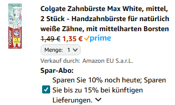 Dank der Bestellung per Amazon Spar-Abo gibt es die Colgate Zahnbürste Max White, mittel, 2 Stück
