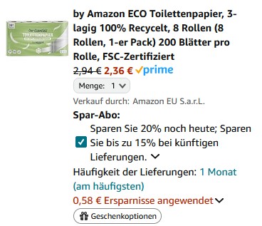 Dank der Bestellung per Amazon Spar-Abo gibt es das Amazon ECO Toilettenpapier, 3-lagig mit 8 Rollen