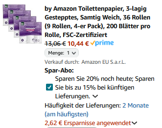 Dank der Bestellung per Amazon Spar-Abo gibt es das Amazon Toilettenpapier, 3-lagig (36 Rollen)