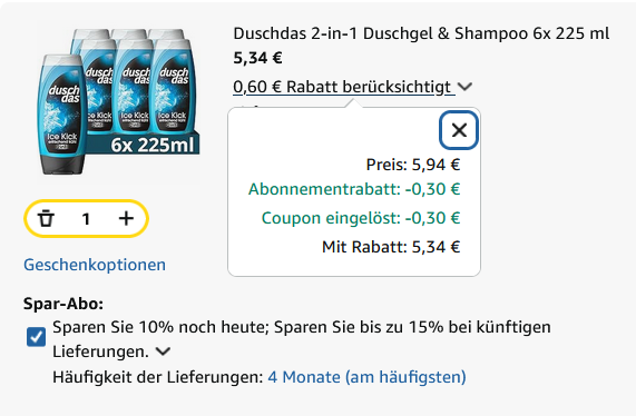 Dank Bestellung per Amazon Spar-Abo gibt es Duschdas 2-in-1 Duschgel & Shampoo 6x 225 ml für effektiv 5,34€. (regulärer Preis: ~7€) Ersparnis: ~2€