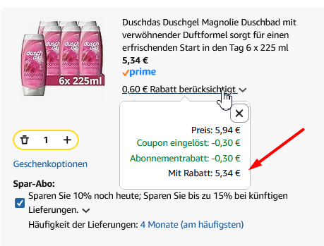 Dank Bestellung per Amazon Spar-Abo gibt es Duschdas Duschgel Magnolie 6x225ml ab effektiv 5,34€. (regulärer Preis: 8€) Ersparnis: 2,66€