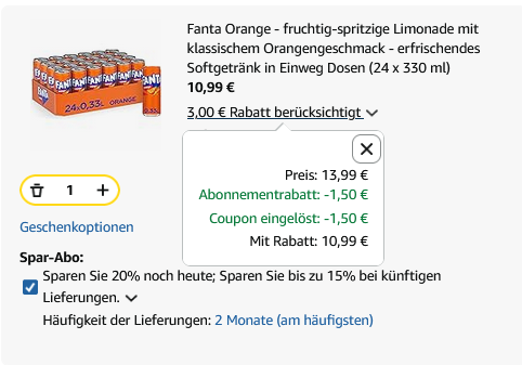 Dank Bestellung per Amazon Spar-Abo gibt es Fanta Orange (24 x 330ml) für 12,59€ + Pfand (ggfs -10% Extra-Rabatt). (regulärer Preis: ~17,76€ + Pfand ) Ersparnis: ~6,77€