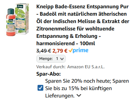 Dank der Bestellung per Amazon Spar-Abo gibt es das Kneipp Bade-Essenz Entspannung Pur – Badeöl – 100ml