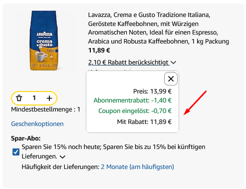 Bei diesem Artikel gibt es für einige Kunden außerdem noch einen weiteren Gutschein zum Aktivieren für die erste Spar-Abo Lieferung in Höhe von zusätzlich 5%.