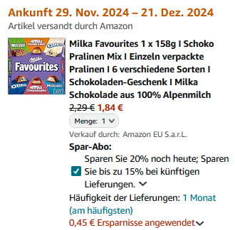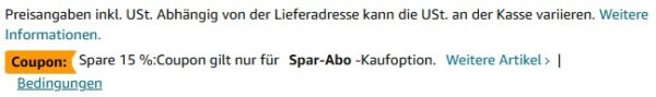Mit dem Spar-Abo profitierst du von kostenlosem Standardversand für automatische Lieferungen (für alle ohne Prime-Mitgliedschaft fallen bei der ersten Lieferung möglicherweise Versandkosten an) und der Möglichkeit, Lieferungen an deinem Spar-Abo-Liefertag zu planen. Qualifizierte Produkte weisen oft einen im Vergleich zum Preis bei Amazon und im Amazon Marketplace reduzierten Preis auf. Du kannst ein Abonnement jederzeit kündigen. 🚫