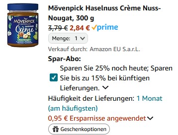 Dank Bestellung per Spar-Abo bei Amazon gibt es das Mövenpick Haselnuss Crème Nuss-Nougat, 300 g