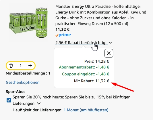 Dank Bestellung per Amazon Spar-Abo gibt es Monster Energy Ultra Paradise 12x500ml ab effektiv 11,32€ + Pfand. (regulärer Preis: ~17,88€) Ersparnis: ~7,50€