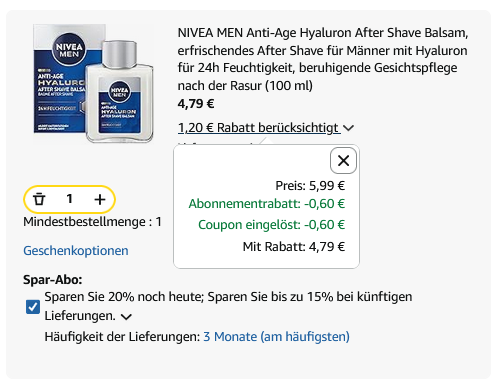 Dank Bestellung per Amazon Spar-Abo gibt es NIVEA MEN Anti-Age Hyaluron After Shave Balsam für effektiv 4,79€. (regulärer Preis: ~6,49€) Ersparnis: ~1,80€