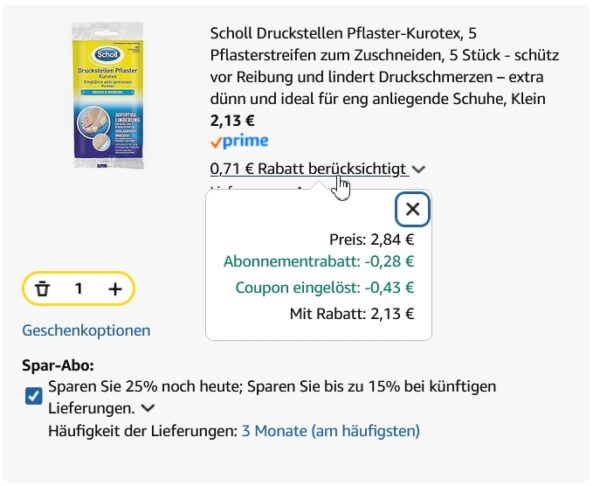 Dank Bestellung per Amazon Spar-Abo gibt es Scholl Druckstellen Pflaster-Kurotex für effektiv 2,13€. (regulärer Preis: ~4,99€) Ersparnis: ~2,43€