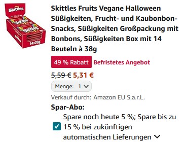 Dank eines befristeten Angebots und der Bestellung per Amazon Spar-Abo gibt es die Skittles Fruits Vegane Halloween Süßigkeiten