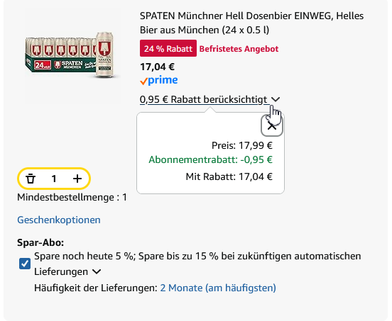 Dank Bestellung per Amazon Spar-Abo gibt es SPATEN Münchner Hell Dosenbier (24 x 0.5l) für effektiv 17,09€. (regulärer Preis: ~23,76€) Ersparnis: ~6,50€