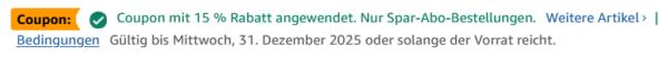 Zusätzlich gibt es aber noch den 15% Gutschein zum Anklicken und damit kommt ihr auf effektiv 18,72€.