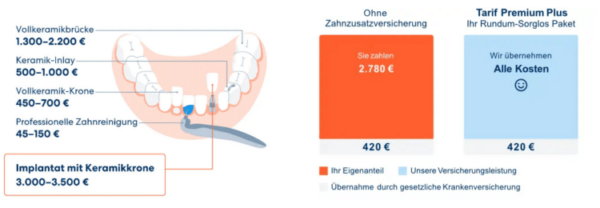 Im Tarif „Soforthilfe“ bekommt ihr eine rückwirkende Versicherung auch für fehlende und beschädigte Zähne, also dann, wenn es eigentlich schon zu spät ist. Es warten bis zu 1.500 Euro Soforthilfe ohne Gesundheitsfragen und Wartezeit.