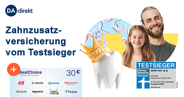 Zähne sind teuer. Aus einem kleinen Loch kann schnell eine größere Operation werden und die Kosten dafür gehen oft in die Tausende. Wenn ihr euch die jetzt die neue und sehr günstige Zahnzusatz-Versicherung der DA direkt holt, bekommt ihr noch einen 30€ Amazon.de-/BestChoice Gutschein* obendrauf. Für den Tarif „Soforthilfe“ gibt es sogar 60€ Bonus.