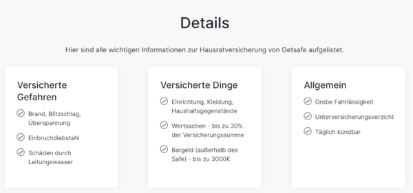 Für genauere Informationen bitte die Website von getsafe konsultieren und das Produktinformationsblatt durchlesen (die Auflistung oben ist nur ein Auszug davon).