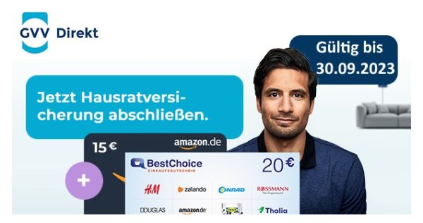 Ihr besitzt eh nicht so viele wertvolle Gegenstände in eurem Hausrat und braucht deswegen keine Hausratversicherung? Falsch! Denn wird euer Eigentum erst einmal aufsummiert, kommt schnell ein beträchtliches Vermögen zusammen. Solltet ihr also noch keine Hausratversicherung besitzen, bekommt ihr jetzt bei GVV Direkt die Gelegenheit dazu, diesen Umstand zu ändern. Und wenn ihr euch für einen Abschluss entscheidet, erhaltet ihr nicht nur vom Versicherungsträger einen 15 € Amazon.de Gutschein obendrauf – von uns gibt es auch noch einen 20€ BestChoice-Gutschein dazu!