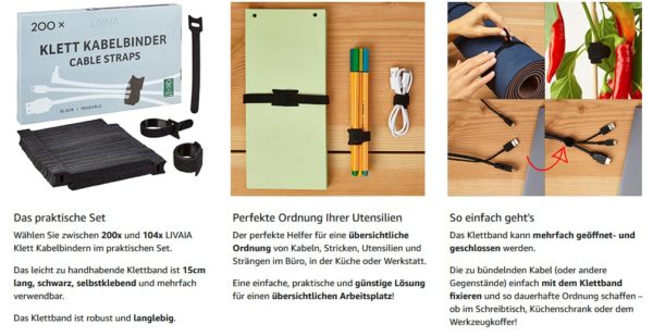 Bei Amazon gibt es 200x Klettband Kabelbinder 15cm für einfaches Ordnen von Kabeln