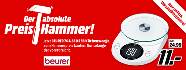 Bei MediaMarkt bekommt ihr aktuell Beurer KS 33 Küchenwaage mit großem Glaswiegeteller und Flüssigkeitsanzeige für 11€ (Vergleichspreis: ~23€) Ersparnis ~12€