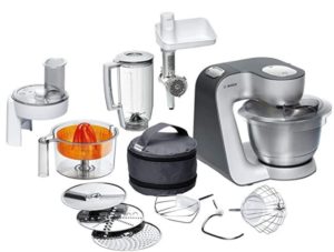 - Lieferumfang: Bosch Styline MUM56340 Küchenmaschine, Mixeraufsatz Kunststoff, Raspelwendescheibe, Reibscheibe mittelfein, Rühr-/Schlagbesen, Schneidwendescheibe, Zitruspresse, Deckel, Durchlaufschnitzler, Edelstahl-Rührschüssel, Fleischwolf, Knethaken Metall, Zubehörtasche dunkelgrau, Rezept-DVD