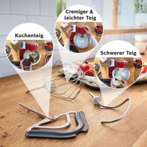 - Inklusive: 4 Scheiben, Durchlaufschnitzeler, Mixeraufsatz, Profi-Patisserieset
