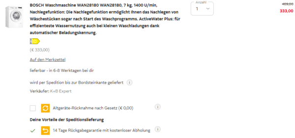 Denn bei OTTO bekommt man den Bosch WAN 28180 Frontlader (7 Kg, 1.400 U/Min) für 385,90€ (Vergleichspreis: ~469€) Ersparnis ~83€