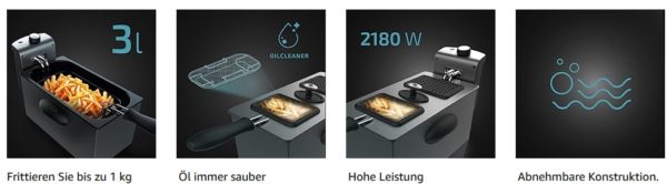 - Inklusive OilCleaner-Filter, um das Öl nach jedem Gebrauch sauber zu halten Es hat 2180 W maximale Leistung, um schnell und effizient zu frittieren und in kurzer Zeit ein perfektes Frittieren zu erreichen