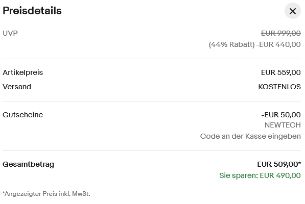 für 509€. (Vergleichspreis: ~555€) Ersparnis ~46€