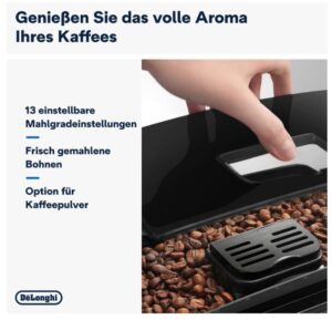 - HOCHWERTIGES MAHLWERK: Das 13-stufige Kegelmahlwerk kann individuell eingestellt werden, es passen 250 g Kaffeebohnen in den Behälter – der Vollautomat eignet auch für die Nutzung mit Kaffeepulver