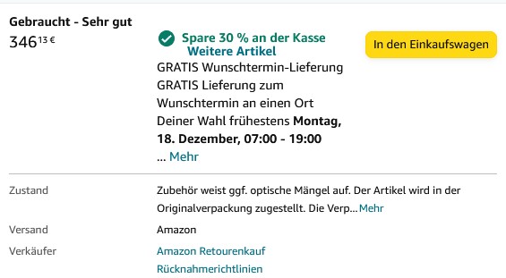 Möglich macht das Ganze die 30% Aktion auf Warehouse-Deals (Amazon Retouren-Kauf)