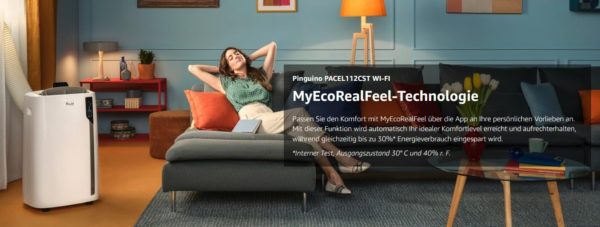 Bei Amazon gibt es die De’Longhi Pinguino PAC EL112 CST WiFi, Mobile Klimaanlage mit MyEcoRealFeel-Technologie für Räume bis zu 110 m³,11.000 BTU/h, 2,9 kW, 63 dB, Entfeuchtungsfunktion, A+, App- und Sprachsteuerung, Weiß