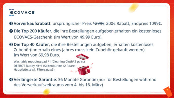 - Die ersten 200 Käufer die die Bestellung aufgeben erhalten außerdem ein kostenloses Ecovacs Geschenk im Wert von 49,99€