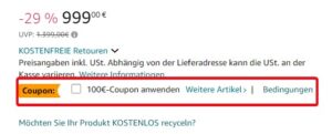 Aktiviert dazu einfach den 100€ Coupon auf der Produktseite und schon kommt ihr auf den genannten Preis.
