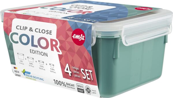 - Lieferumfang Emsa N1031000 Clip & Close Color Edition 4-teiliges Frischhaltedosenset (0,2/0,55/0,8/2,2 l), Puder Grün