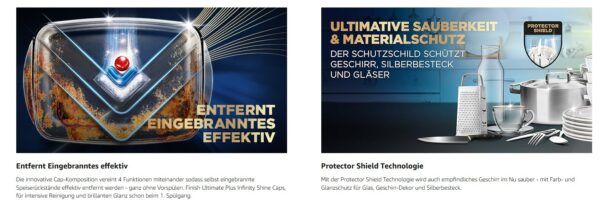 - CYCLESYNC-Technologie: Der richtige Inhaltsstoff* entfaltet sich genau im richtigen Moment, sodass selbst eingebrannte Speiserückstände effektiv entfernt werden. *Inhaltsstoff: Enzym