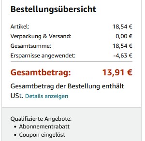 für 13,91€ (Vergleichspreis: ~26€, aber online) Ersparnis ~12€