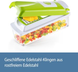 Der Nicer Dicer besteht aus mehreren austauschbaren Schneideinsätzen, die verschiedene Schnittarten und -größen ermöglichen. Benutzer können zwischen groben und feinen Würfeln, Scheiben, Streifen und Julienne wählen. Dies macht den Nicer Dicer besonders nützlich für die Zubereitung von Salaten, Gemüsegerichten, Obstsalaten und vielem mehr. Die scharfen Edelstahlklingen sorgen für präzise Schnitte, während das ergonomische Design die Handhabung komfortabel und sicher macht.