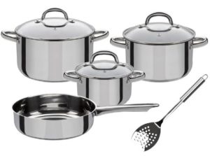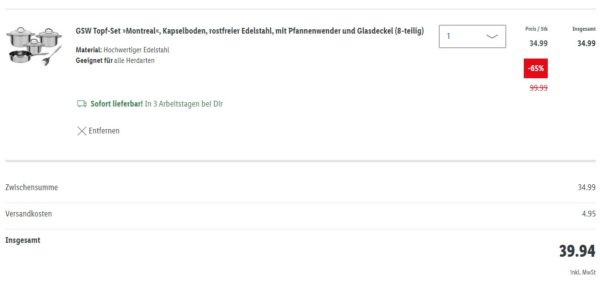 Bei LIDL bekommt ihr das GSW Topf-Set 8-teilig »Montreal«, Kapselboden, rostfreier Edelstahl, mit Pfannenwender und Glasdeckel für 39,94€ (Vergleichspreis ~99€) Ersparnis ~59€