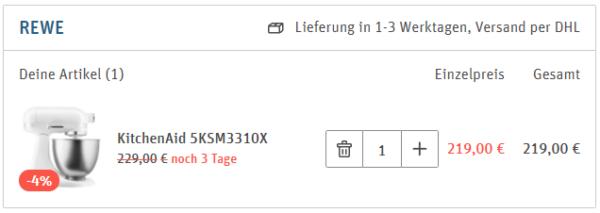 Denn bei REWE bekommt man im Online-Shop die KitchenAid Küchenmaschine (5KSM3310X) für 219€ (Vergleichspreis ~274€) Ersparnis ~55€