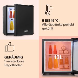 - GETRÄNKE, LEBENSMITTEL, KOSMETIK & MEHR: Mit diesem Flaschenkühlschrank für Zimmer, Hotel und Büro hast du alles immer griffbereit. Auch bei reduzierter Größe bietet der 13-Liter-Mini Fridge genügend Platz für Bier, Snacks und Skincare-Produkte.