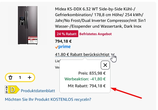 Bei Amazon gibt es den Midea Side-by-Side Kühl-Gefrierkombination mit Eis- und Wasserspender für 835,99€. 794,18€ (Vergleichspreis: ~1.008€) Ersparnis: ~214€