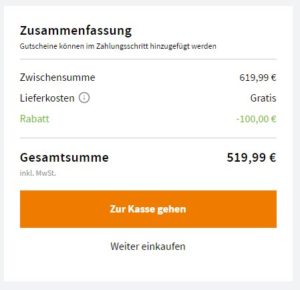 Auf den Preis kommt ihr durch einen 100€ Direktabzug im Warenkorb und den 10€ Newsletter-Gutschein
