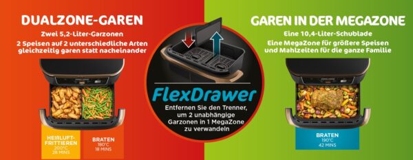 - FLEXDRAWER PASST SICH JEDER MAHLZEIT AN: Entfernen Sie den Trenner, um 2 unabhängige Kochzonen in eine extra große 10,4L MegaZone zu verwandeln, um größere Lebensmittel zu kochen. Für 8+ Personen geeignet.