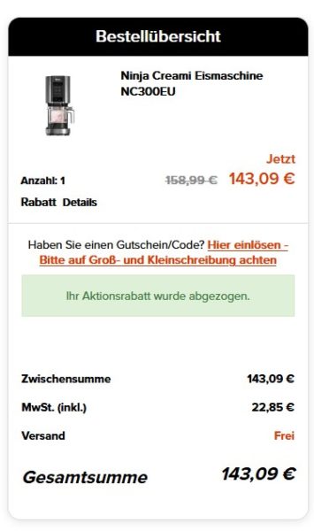 Bei ninjakitchen erhaltet ihr die Ninja NC300EU Creami Eismaschine (800 Watt) ab 143,09€ (Vergleichspreis aktuell: ~220€) Ersparnis bis zu ~77€