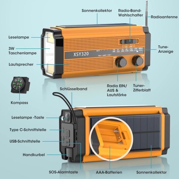 - 5000-mAh-Notstrombank: Die Akkukapazität dieses Kurbelradios ist doppelt oder sogar viermal so hoch wie die anderer Solarradios auf dem Markt, was die Akkulaufzeit des solar radio erheblich verlängert. Selbst bei einem Stromausfall oder Notfall kann das notfallradio kurbel solar usb über das mitgelieferte USB-Typ-C-Kabel zur Notstromversorgung eines Mobiltelefons oder Tablets verwendet werden. Es ist ein unverzichtbares Werkzeug in Ihrer Überlebensausrüstung.