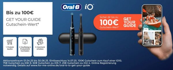 Laut Aktionsseite nimmt die Zahnbürste wohl auch an der GetYourGuide Aktion (Bedingungen) teil, bei dem ihr einen 50€ Gutschein bekommt. (EAN müsste diese sein: 4210201415107) (Einlöselink)